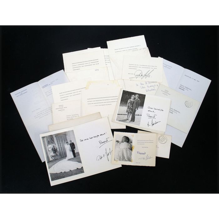 Een collectie van 12 bedankkaarten van Prinses Margriet en Pieter van Vollenhoven naar aanleiding van diverse feestelijke gelegenheden tussen 1967 en 1970. Twee exemplaren met een brief door hun particuliere secretarissen. Drie exemplaren voorzien van een foto. Met de oorspronkelijke enveloppen van verzending, diverse formaten. Prijs samen € 125.-