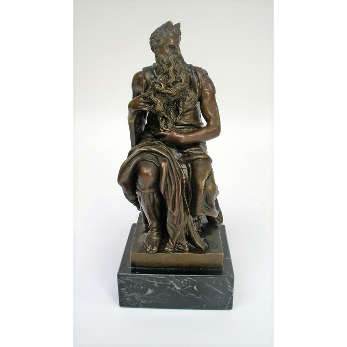 Bronzen beeld met de voorstelling van Mozes naar voorbeeld van het grote beeld door Michelangelo dat zich bevindt in de Basiliek van San Pietro in Vincoli in Rome. Gemerkt op de onderrand 'Michel-Ange' en voorzien van een gietersmerk. Mogelijk een Grand Tour souvenir, datering eind 19e eeuw of begin 20e eeuw. Hoogte 22,5 cm, op grijsmarmeren voet. Gewicht 2710 gram. (Verkocht)