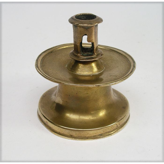 Een geelkoperen rokkandelaar in gotische stijl. Spanje, datering 16e eeuw. Hoogte 90 mm. (Verkocht)