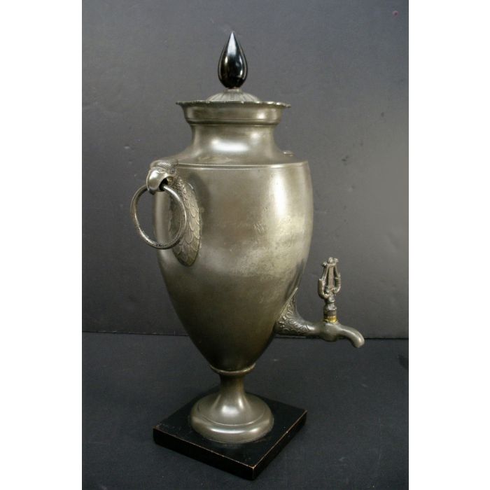 Een urnvormige tinnen kraantjeskan met oren in de vorm van vogelkoppen, op houten voet, zgn. 'Dröppelminna'. In de deksel gemerkt met een gietmerk. Duitsland, datering eerste helft 19e eeuw. Hoogte 44 cm. (Verkocht)